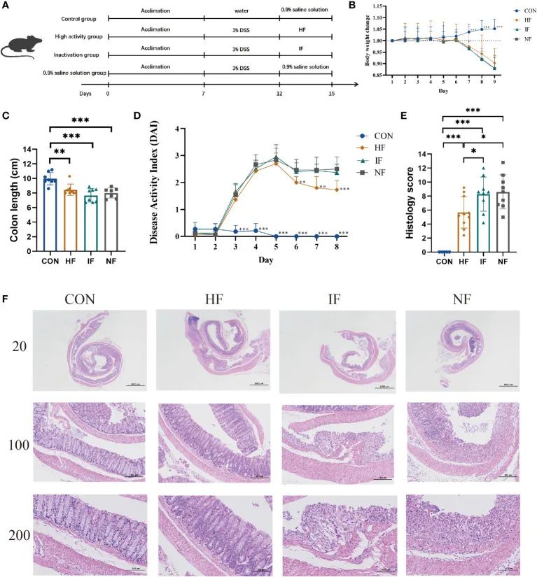 為了研究FMT中活菌對結腸炎的緩解作用。我們通過給30只小鼠水中添加3%DSS,自由飲水連續(xù)5天,誘導潰瘍性結腸炎小鼠模型。然后在第6天開始對小鼠進行FMT干預,連續(xù)3天(圖1A)。對照組(CON)的小鼠(n=10)精神狀態(tài)良好,沒有腹瀉和軟便。DSS小鼠從造模第3天開始出現(xiàn)稀便,隨后出現(xiàn)嚴重的軟便、血便。DSS誘導的小鼠被平均分為三組,分別進行FMT的高活性糞便、滅活糞便和生理鹽水治療。從圖1B中,我們可以看到前4天HF組(高活性糞便組)、IF組(滅活糞便組)和NF組(生理鹽水組)之間沒有明顯的差異,所有小鼠體重均呈下降趨勢。IF結腸長度與CON組相比,結腸長度明顯減少,而HF組、IF組和NF組之間沒有明顯的差異(圖1C)。DSS誘導的小鼠的DAI評分在第3天增加,其中HF組的小鼠在第3天的DAI評分明顯高于CON組,HF組的小鼠的DAI評分明顯低于NF組(圖1D)。在組織學評分方面,HF組的評分明顯低于IF和NF組,而IF組和NF組之間沒有顯著差異(圖1E)。同時,組織學分析進一步揭示了觀察到的結腸標本的組織病理學狀況如圖1F所示,CON組和HF組的結腸組織形態(tài)正常, 組織結構層次分明,粘膜層、粘膜下層和肌肉層清晰可見,隱窩和杯狀細胞良好,排列整齊。而IF組和NF組看到不同數(shù)量的炎癥細胞,潰瘍病灶附近的隱窩擴張??傊?,這些結果表明,F(xiàn)MT中的活菌能夠參與并改善臨床上的結腸炎癥狀況和結腸損傷,而死菌則不能。