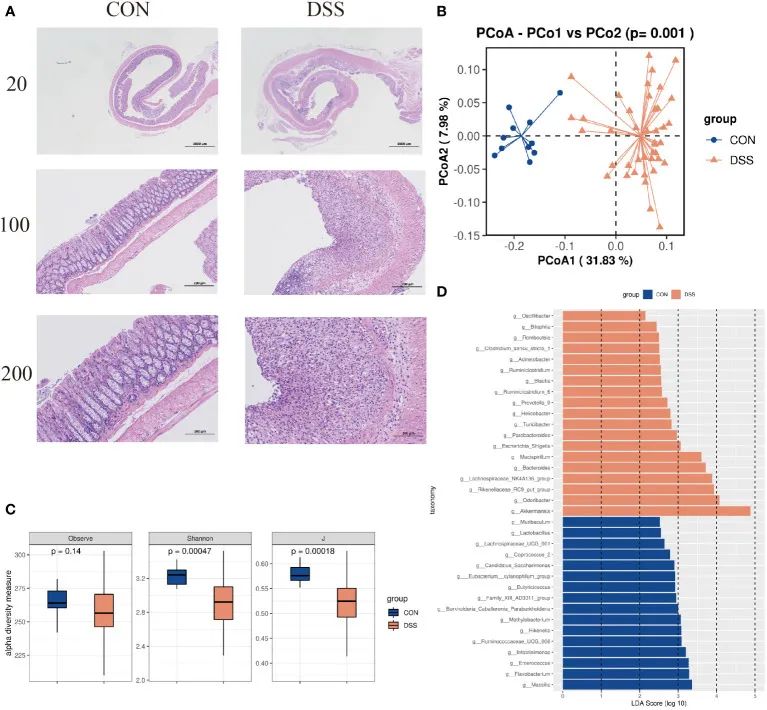 ·DSS小鼠與正常小鼠之間的組織學和活的細菌群落差異