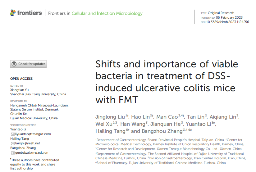 近日,承葛生物聯(lián)合山西省人民醫(yī)院、廈門聯(lián)合呼吸健康研究院、西安市中心醫(yī)院、福建中醫(yī)藥大學等三甲醫(yī)院與高校在腸道微生態(tài)領域頂級期刊《Frontiers in Cellular and Infection Microbiology》(IF: 6.073, JCR: Q1)發(fā)表活菌分析的研究性論文。文章以潰瘍性結腸炎(UC)為例,開創(chuàng)性的結合PMA和16s rRNA基因測序技術,建立了菌群中活菌數(shù)量與組成結構的分析方法 (已獲授權發(fā)明專利,點擊查看);進一步通過菌群移植實驗表明,只有移植活的腸道菌群才能顯著改善UC小鼠的表型、組織病理與腸道菌群結構,揭示了高活性菌群在菌群移植中的重要性!文章還深入分析了UC小鼠失衡的活菌特征、以及與菌群移植治療帶來的小鼠癥狀改善密切相關的活菌種類等,為揭示腸道微生物及菌群移植與UC的發(fā)生發(fā)展和治療之間的重要關系提供了新視角和新證據(jù)。