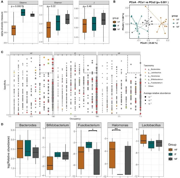通過16S rRNA基因高通量測序分析了HF、NF和IF組的腸道微生物群的變化。HF組的豐富度指數(shù)顯著低于IF和NF組,但Shannon和J指數(shù)沒有明顯差異(圖4A);PCoA圖分析顯示,治療后三組的活的細菌群落結構存在著顯著差異(P<0.05,圖4B)。利用SPEC-OCCU對HF、IF和NF組的微生物群進行特異性和占有率(≥0.7)分析(圖4C),共鑒定到與HF組密切相關的五個特定的屬,即Bacteroides、Lactobacillus、Halomonas、Bifidobacterium和Fusobacterium。Fusobacterium的相對豐度在IF組顯著高于NF組(P<0.05),而HF組與其他兩組沒有明顯差異。然而,HF組的Halomonas和Lactobacillus的相對豐度明顯高于IF組(圖4D)。在FMT前和后對比分析中,也觀察到Bacteroides、Lactobacillus、Halomonas、Bifidobacterium和Fusobacterium的相類似的變化趨勢。本次研究鑒定出多個發(fā)生顯著改變的活細菌屬,他們對UC的癥狀的改善可能起著核心作用,這可能對UC的診斷和治療具有潛在的意義,值得進一步深入探索。